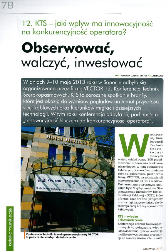 W dn. 9-10 maja 2013r. w Sopocie odbyła się organizowana przez firmę VECTOR 12. Konferencja Technik Szerokopasmowych. KTS to coroczne spotkanie branży, które jest okazją do wymiany poglądów na temat przyszłości sieci kablowych oraz kierunków migracji dzisiejszych technologii. W tym roku konferencja odbyła się pod hasłem „Innowacyjność kluczem do konkurencyjności operatora.”