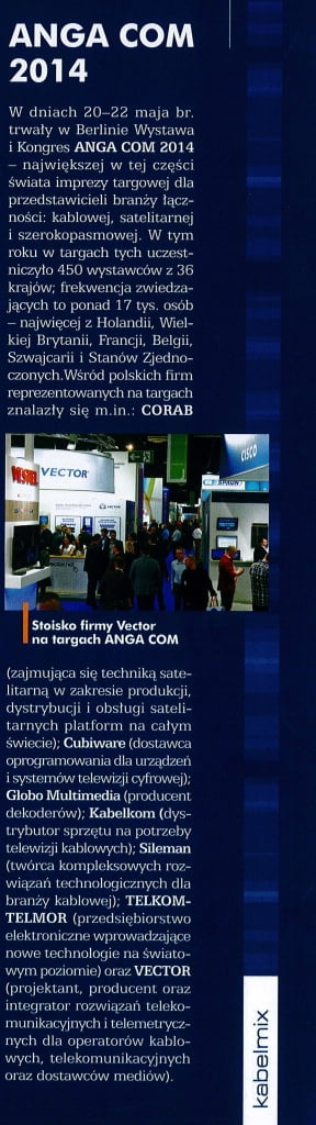 W dniach 20-22 maja br. odbyła się w Kolonii Wystawa i Kongres ANGA COM 2014 – największa w tej części świata impreza targowa dla przedstawicieli branży łączności: kablowej, satelitarnej i szerokopasmowej. W tym roku w targach tych uczestniczyło 450 wystawców z 36 krajów; frekwencja zwiedzających to ponad 17 tys. osób – najwięcej z Holandii, Wielkiej Brytanii, Francji, Belgii, Szwajcarii i Stanów Zjednoczonych.