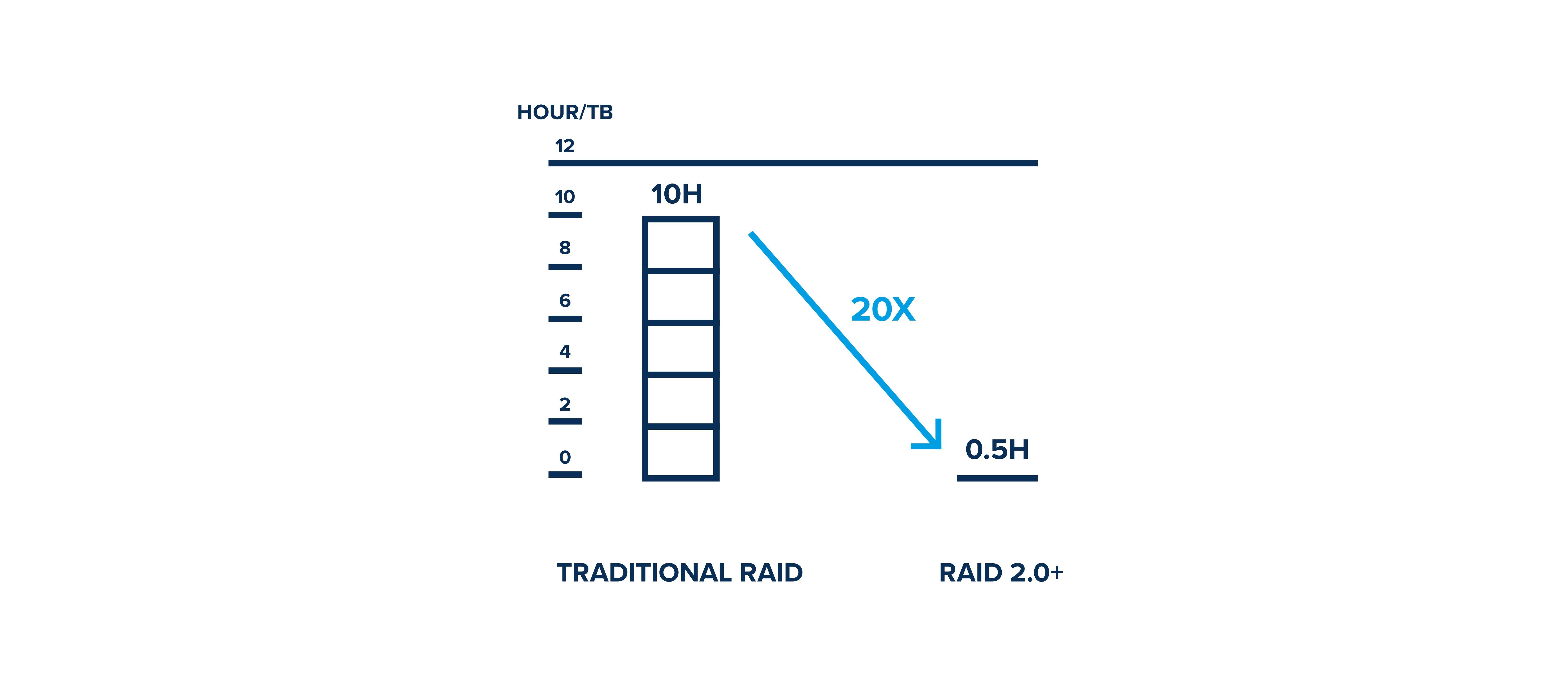Dzięki eliminacji tzw. „wąskich gardeł”, jakim w poprzednich wersjach technologii RAID są wspomniane pojedyncze dyski, znacznie skraca się czas odbudowy danych. Korzystając z macierzy wyposażonych w RAID 2.0+, odzyskanie 7.68TB danych zajmuje zaledwie 9 minut!.
