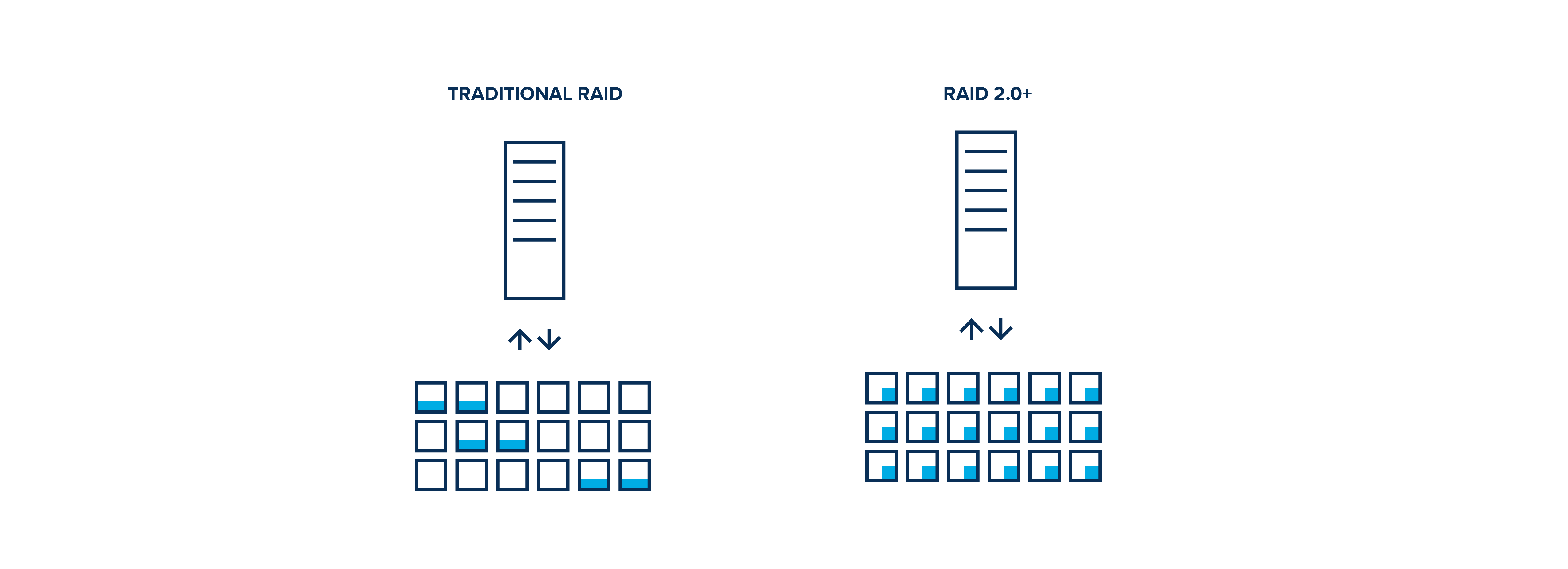 Gdy jeden z dysków okazuje się wadliwy lub w przypadku dysków SSD, kiedy tracimy pojedyncze komórki flash, bloki danych zostają przeniesione równomiernie na pozostałą przestrzeń dyskową. RAID 2.0+ jest efektywniejszy od tradycyjnych RAIDów, ponieważ w swojej pracy wykorzystuje wydajność wszystkich dysków, a nie tylko pojedynczej grupy. Oto, jak wygląda różnica w pracy tradycyjnego RAID i RAID 2.0+.