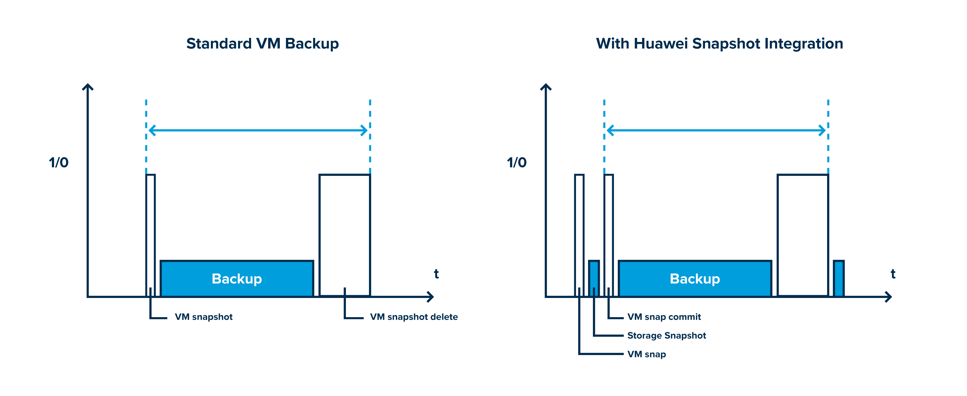 Nowa integracja sprawia, że rozwiązanie Veeam może utworzyć migawkę Huawei w tle bezpośrednio po wykonaniu migawki maszyny wirtualnej. Wszystko przebiega niemal błyskawicznie. W poniższym przykładzie migawka maszyny wirtualnej VMware pozostaje otwarta tylko do czasu utworzenia migawki pamięci masowej, dzięki czemu wymagany czas otwarcia migawki VMware jest krótszy.