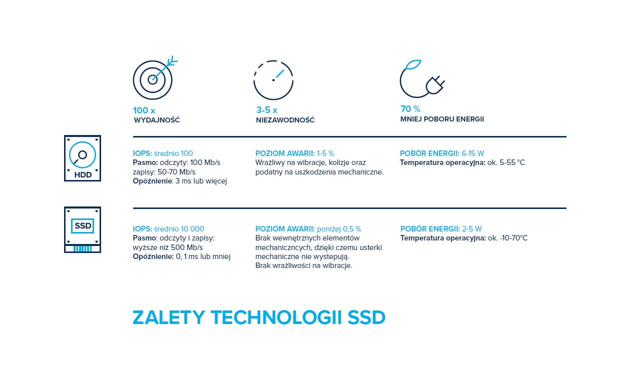 Dyski magnetyczne pojawiły się na rynku w 1956 roku. Od momentu powstania zwiększyły swoje zasoby pamięci milion razy, z kolei ich koszt per gigabajt zmniejszył się aż 2 miliardy razy. To efekt pracy producentów, którzy systematycznie rozwijali wykorzystywane technologie. Na przestrzeni lat skracał się chociażby czas wyszukiwania danych. Talerze dysków stawały się zaś coraz mniejsze, zaś ich gęstość i prędkość obrotu rosły. A to tylko kilka przykładów zmian. Mimo tak wielkiego postępu, elementy mechaniczne wciąż posiadają pewne fizyczne ograniczenia. Stąd nawet najlepsze rozwiązania nie są wolne od ryzyka spadku wydajności działania, związanego z pracą komponentów wewnętrznych.